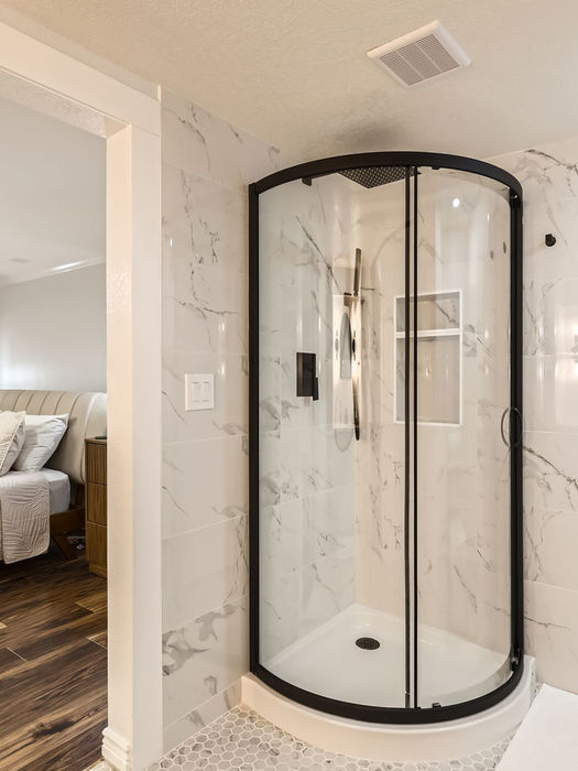 This basement was essentially unfinished and empty. We designed it head to toe with a full living space build out, bathroom, and closet system.